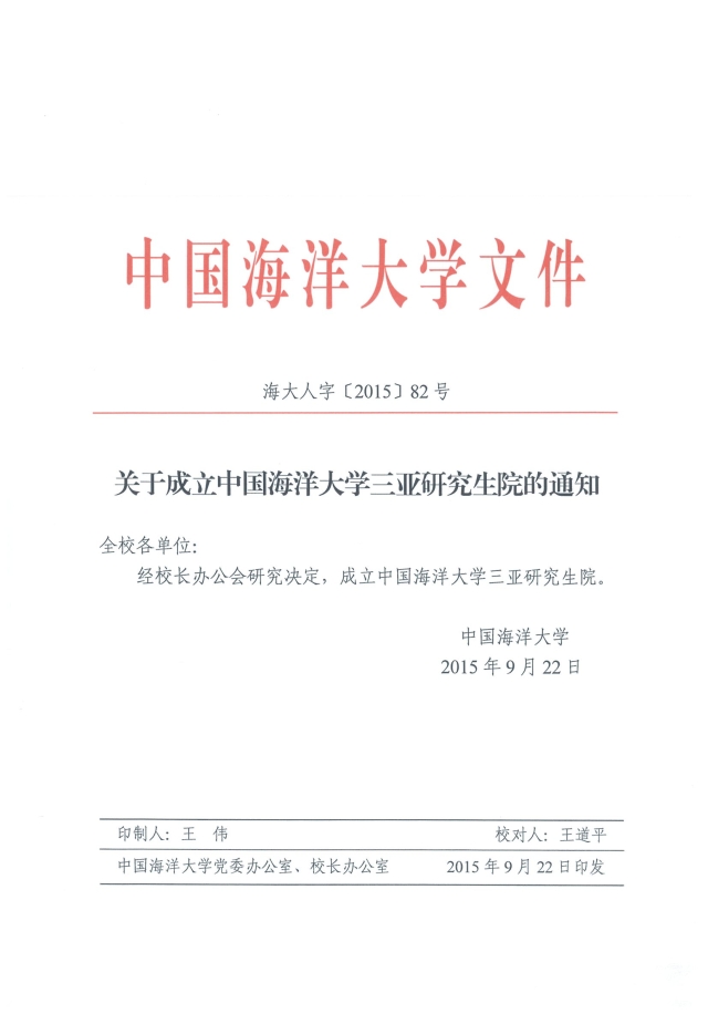 关于成立中国海洋大学三亚研究生院的通知