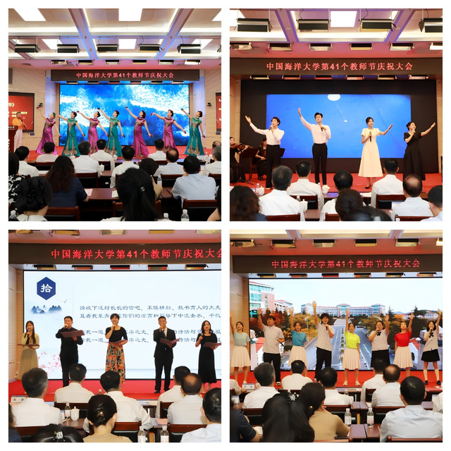 庆祝大会上,离退休教师带来风采展示《银龄风华》,用悠扬的笛声和优雅的风采,展现了岁月馈赠的智慧与从容;基础教学中心师生带来重唱《奉献》,用美妙的旋律为教育工作者们献上赞颂与祝福;在校师生代表共同朗诵了诗歌《向知识大海的领航者——教育家致敬》,饱含对“海大大先生”的崇高敬意和对教育家精神的深切礼赞;大学生艺术团同学们带来了歌舞《一起向未来》,朝气蓬勃的歌舞既传递出对教师的深切敬意,也展现了师生对学校美好未来的共同期许。